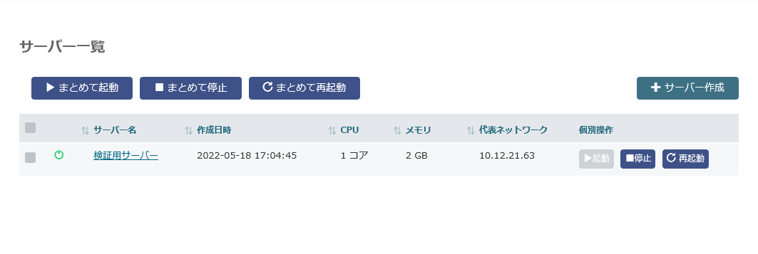 「サーバー一覧」の画面が表示されますので、右側の「サーバーを作成」を選択します。